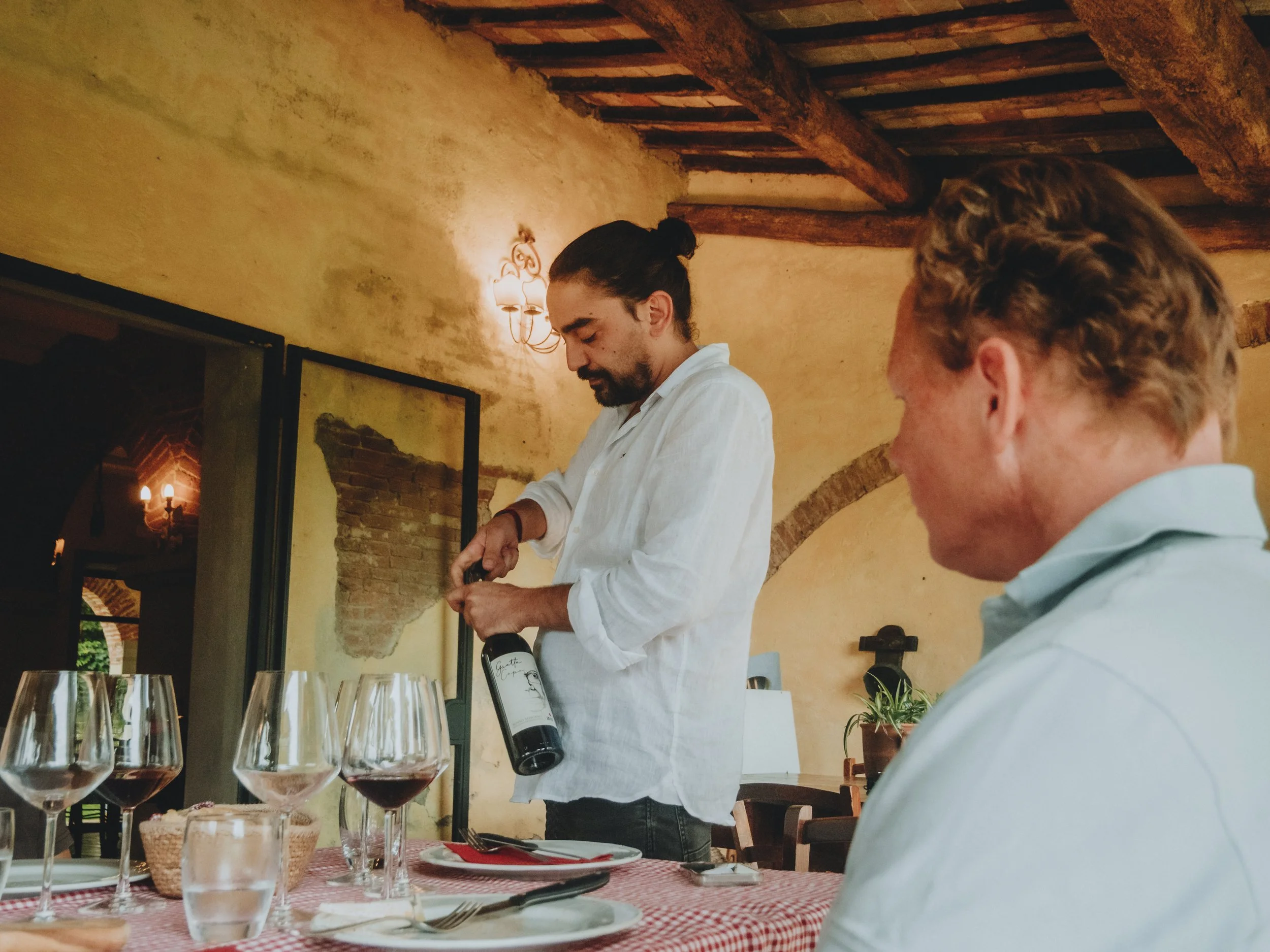 Spend a relaxed evening discovering Tuscan wines with Luca, our sommelier. This is not a formal tasting or a lesson. You sit, you taste, and Luca explains the wines and food in a simple, clear way, like he would at a dinner with friends.