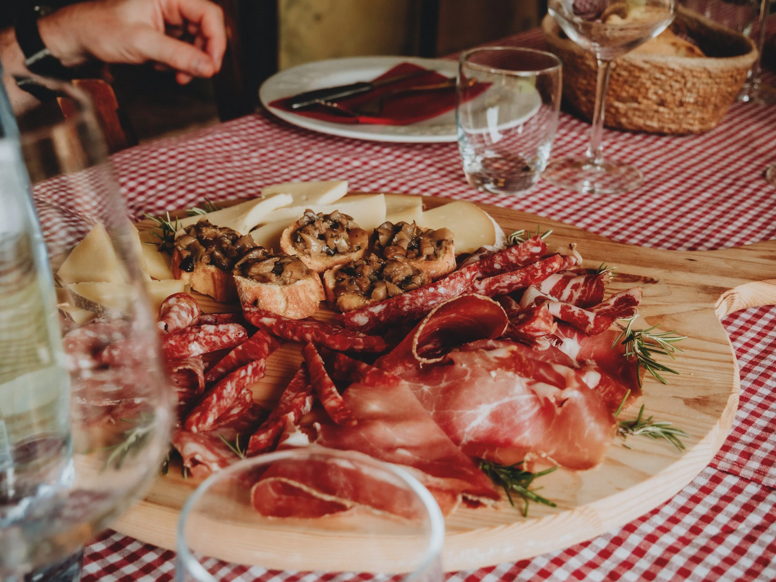 The tasting is hosted by Luca, our sommelier. You will taste four Tuscan wines, each served with a board of local cheeses and cured meats: