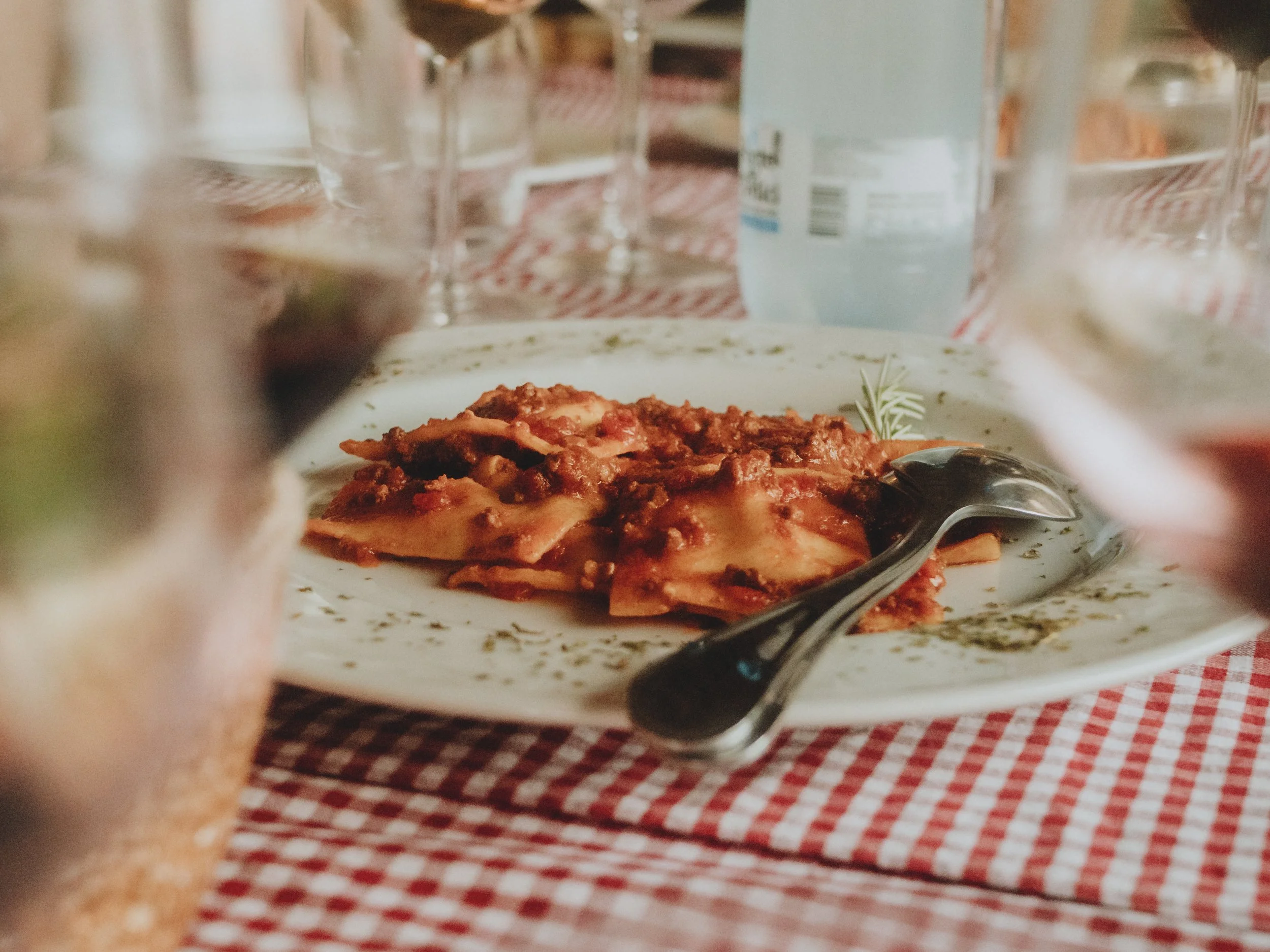 Handmade tortello filled with ricotta, served with traditional Tuscan meat ragù, paired with Rosso di Montalcino – Castello di Tricerchi.